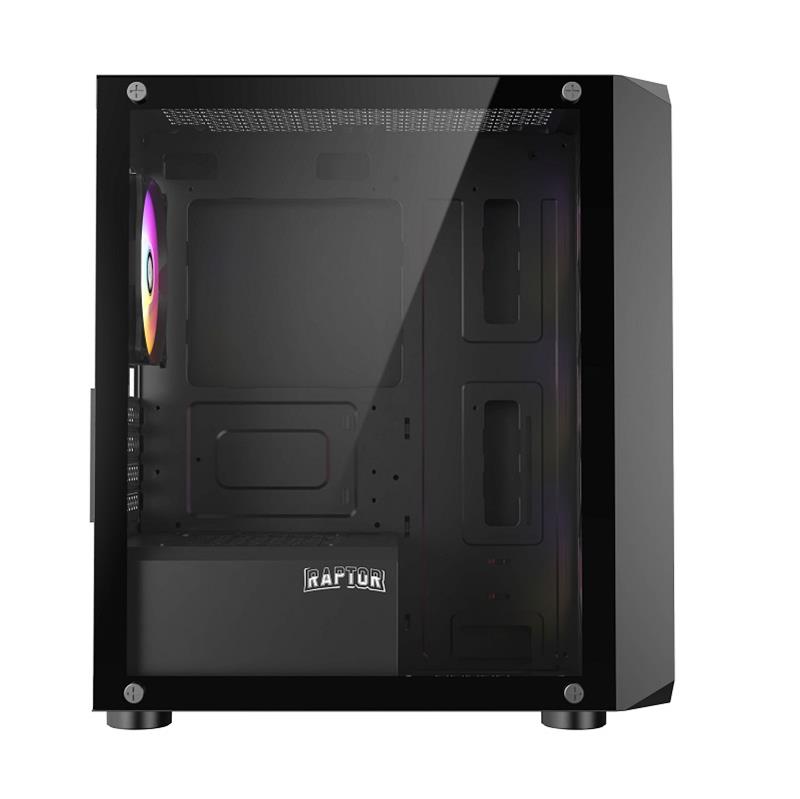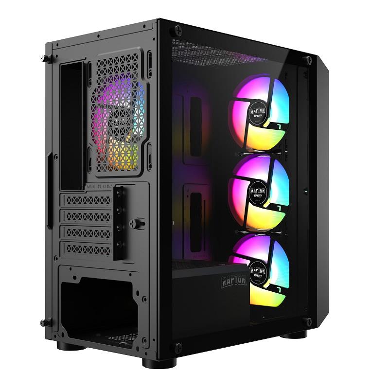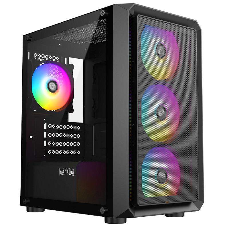 Gabinete Raptor Mini Tower. Incorpora 3 coolers RGB (2 superiores de 120mm y 1 Trasero de 120mm). Paneles Frontal y Lateral izquierdo de Vidrio. No incluye Fuente de Alimentación.